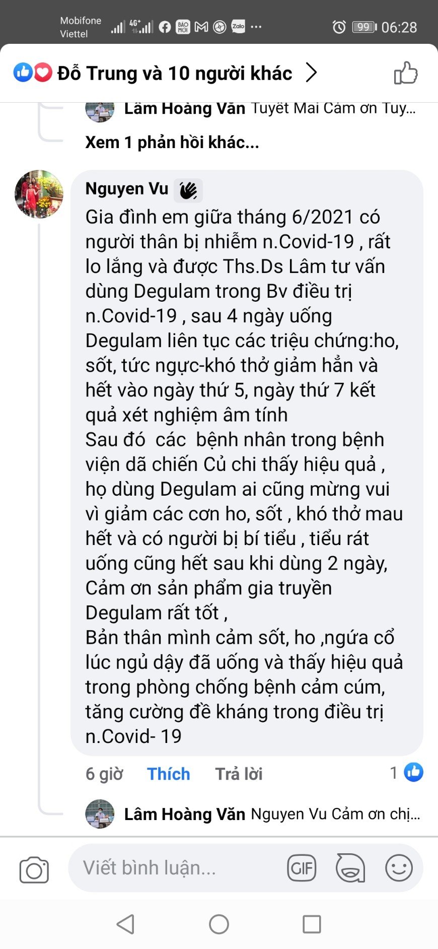 Cảm ơn Dược sỹ Đại học Nguyen Vu đã chia sẻ trong nhóm Facebook “DEGULAM HIỆU QUẢ SỬ DỤNG”. Ds. Nguyen Vu là người mua rất nhiều Degulam để làm thiện nguyện, tặng bạn bè, người thân, người nhà, thậm trí chính bản thân Dược sỹ sử dụng, để chữa bệnh Cảm cúm và uống phòng dịch bệnh. ThS. Hoàng Văn Lâm xin chia sẻ lại nguyên văn như sau:
